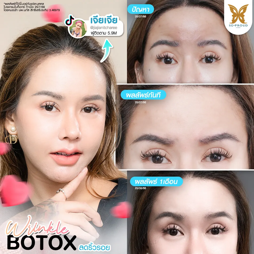 หนึ่งในปัญหาผิวที่เริ่มเห็นชัดเมื่ออายุเพิ่มขึ้นคือ ริ้วรอย ไม่ว่าจะเป็นบริเวณหน้าผาก หว่างคิ้ว และรอบดวงตา ล้วทำให้ใบหน้าดูมีร่องรอยและดูมีอายุ การทำโปรแกรมโบท็อกซ์จะช่วยลดริ้วรอย ทำให้ผิวกลับมาดูตึงกระชับ เรียบเนียนขึ้น โดยดีเจเจียเจียเลือกใช้ Botox สัญชาติเกาหลี จำนวน 100 Units ซึ่งมีคุณสมบัติลดการทำงานของกล้ามเนื้อ โดยเน้นผลลัพธ์ที่ดูเป็นธรรมชาติ ไม่แข็งตึง หลังรับบริการเพียง 1 สัปดาห์ ก็สามารถเห็นผลลัพธ์ผิวหน้าที่ดูกระชับขึ้น ริ้วรอยลดเลือนลงอย่างเห็นผล