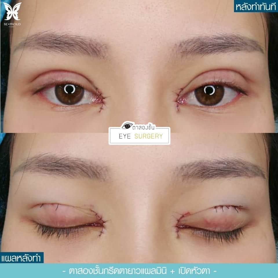 จะเห็นแผลบริเวณมุมหัวตาด้านบน หากทำตามคำแนะนำของแพทย์ จะลดโอกาสการเกิดแผลคีลอยด์ได้ แต่แผลจะค่อยๆ จางลงหลังจากรับบริการไปประมาณ 1 เดือน การผ่าตัดเปิดหัวตา จำเป็นต้องทำกับแพทย์ที่ความชำนาญ เท่านั้น