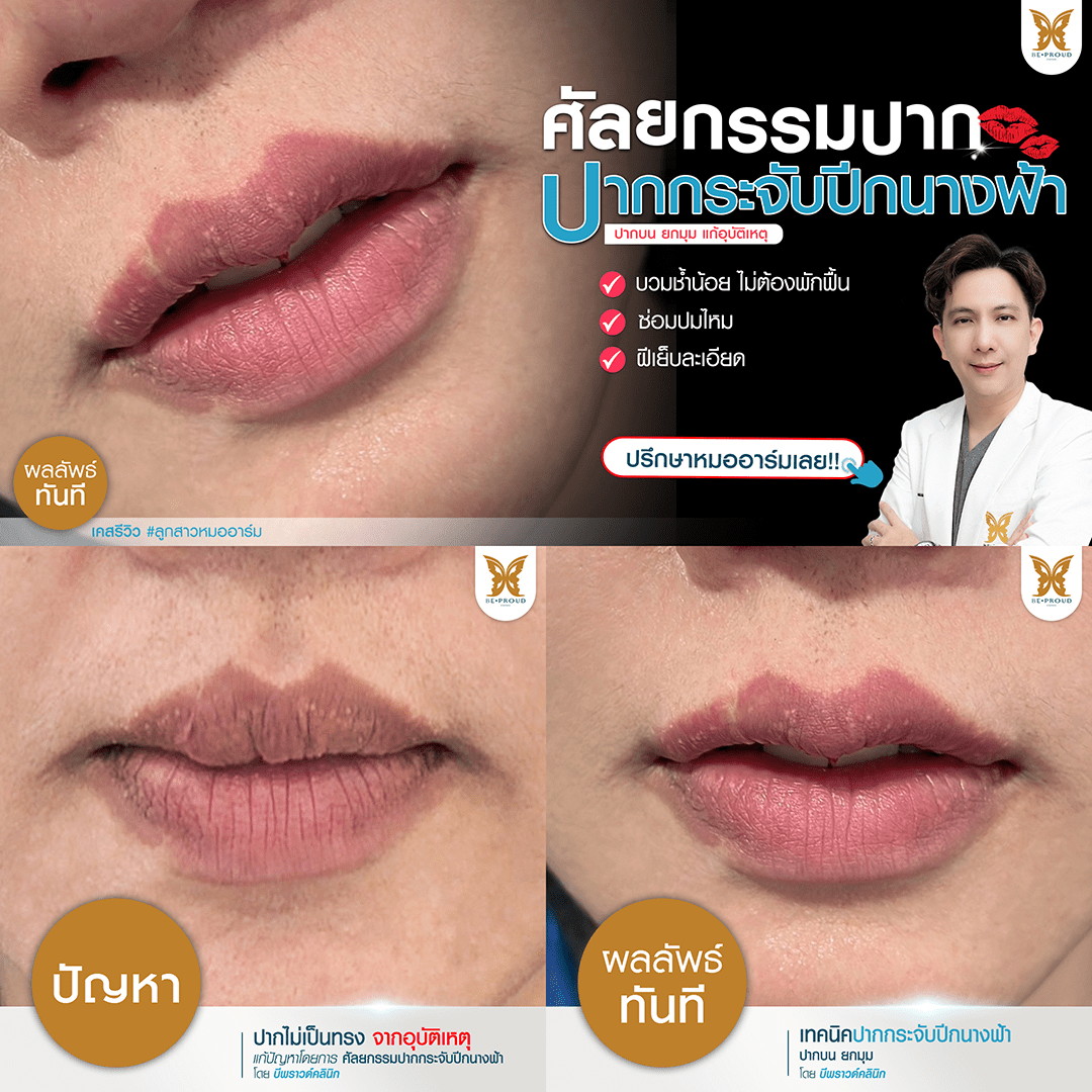 A : หลังผ่าตัดจะมีอาการบวมช้ำใน 2-3 วันแรก โดยจะเริ่มเห็นทรงปากหลังตัดไหม (14 วัน) ทั้งนี้ ปากจะเข้าที่ดีเมื่อเข้า 1 เดือน และเข้าที่จนเห็นทรงแท้จริงใน 2-3 เดือน