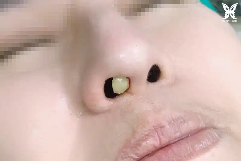 ลักษณะอาการจะเห็นขอบซิลิโคนบริเวณปลายจมูกเด่นชัด เพราะเนื้อตรงปลายจมูกบางลง ถ้าปล่อยไว้ซิลิโคนมีโอกาสทะลุออกมาได้